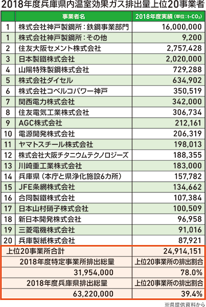 県の環境の保全と創造に関する条例対象の1,066事業所の2018年度の排出量は3,195万4,000トンで、県全体の50.5%を占めているが、そのうち神戸製鋼や日本製鉄、関西電力、電源開発、川崎重工、住友大阪セメントなどの電力、鉄鋼、セメント業など、わずか20の事業所で約2,491万4,000トンもの温室効果ガスが排出され、条例対象事業所排出分の実に78%、県内排出量全体の約40%となっている。