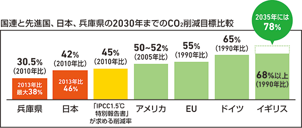 IPCC提起の2010年比45%削減は、兵庫県では2013年比51%、国際社会が日本に求める2010年比50%から60%は、兵庫県では2013年比56%から64%の目標が必要となる。