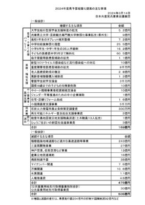 組替えでは、まず全体の規模は、一般会計で見直しが必要な事業67項目、合計475億円(約2%)を減らし、そこから生み出された一般財源、特定財源など約169億円を、若者・子育て応援パッケージ、コロナ対策・福祉充実、中小企業・小規模農業支援、ジェンダー平等施策、脱炭素、災害対策など26項目の増額に充当しています。