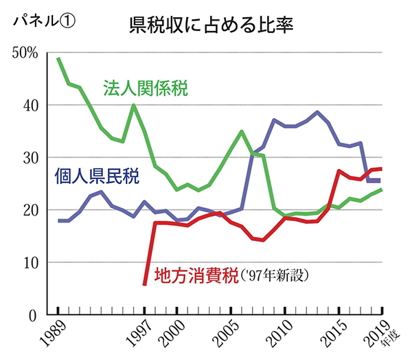 消費税増税をやめる、あるいは、減税した場合、別のところから財源を確保する必要が出てくる。もう一度、パネル1を見ていただきたいと思うが、パネルにもあるように、以前は、かつては法人関係税が県税収入の中で大きな割合を占めていた。なぜ法人事業税収がこのように右肩下がりになってきたのか、お答えいただきたい。