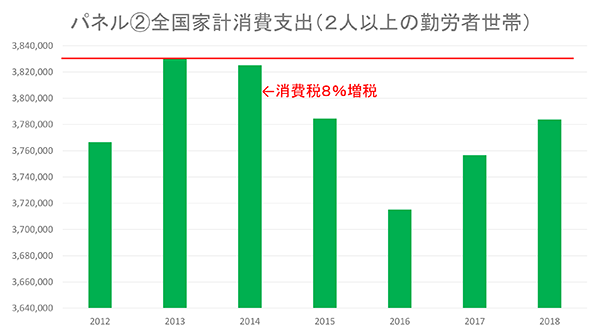 お答えのように、増税前の2013年平均は383万円、消費税8%増税のあった2014年は駆け込み需要があり、382万5,057円、2015年は378万4,550円、2016年は371万5,092円、2017年は375万6,687円、2018年は378万3,769円で、消費税増税前の13年から昨年2018年では年額4万6,266円も落ち込んでいる。