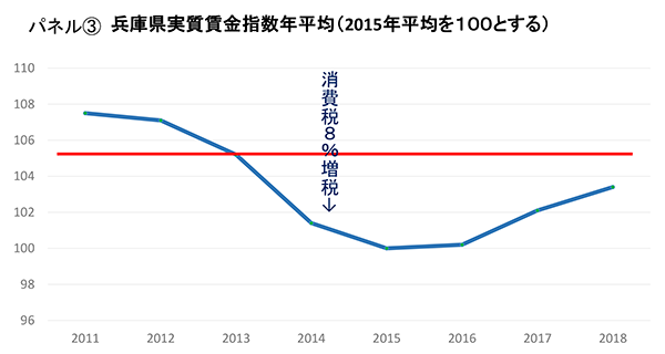 〇答弁:統計課長(橘田幸雄) 実質賃金についてであるが、厚生労働省実施の毎月勤労統計調査によると、兵庫県の実質賃金指数の年平均であるが、事業所規模5人以上の事業所で、2015年を100として、2013年が105.2、2018年が103.4となっているところである。