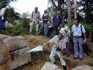徳川幕府による大坂城再築(一六二〇〜二九年)の際の大規模な採石場跡が発掘された芦屋市岩園町で十八日、見学会がおこなわれ、小雨のなか市民や研究者など約四十人が参加しました。 同遺跡は、西宮市から神戸市東灘区の六甲山系にまたがる「徳川大坂城東六甲採石場」の一部で、芦屋市教委が六月に同町と六麓荘町の二カ所で確認したもの。当時の採石活動の実態がわかる、全国最大規模の貴重な遺跡ですが、宅地開発の予定地となっています。 市職員の案内で急斜面に点在する石材を見学。巨大な花こう岩に、くさびを入れるためにうがった「矢穴」や、城の再築を請け負った大名が彫った「刻印」を見つけると、参加者は大きな歓声をあげていました。 参加した前大阪城天主閣館長の渡辺武さんは、「大阪城がよく見える最高の場所でこれだけ重要な遺跡が顔を出したのだから、ぜひ保存をお願いしたい」と語りました。 芦屋、西宮市民などでつくる「徳川大坂城東六甲採石場遺跡の保存を求める市民の会」は、遺跡公園としての保存を求めて県知事や芦屋市長あての署名運動をスタート。二十二日には、村川行弘・大阪経済法科大学名誉教授を招いて、午前十時から芦屋市民センターで講演会を開きます。 |