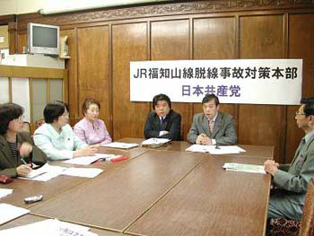 本会議終了後、衆院党控室で第一回の会合を開いた。国土交通省の担当者から事故の概要や現状について説明を受けた後、昨夜急遽現場入りした小林みえこ参院議員、いち早く駆けつけた吉井英勝衆院議員の報告を受け、今後の対応を協議した。 新しいATS(列車自動制御装置)が十分に整備されていない、過密状態だった運行ダイヤなど、事故の背景には、「利益優先で安全がないがしろにされている」問題があるのではないか、などの意見が出された。 会合には、ほかに仁比そうへい事務局長・参院議員、石井郁子・高橋千鶴子両衆院議員が出席した。