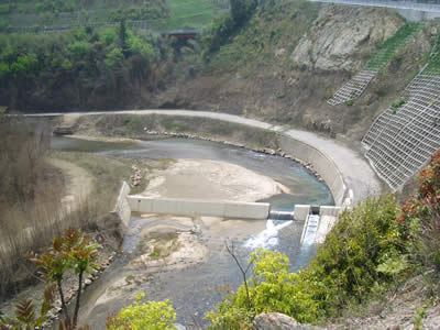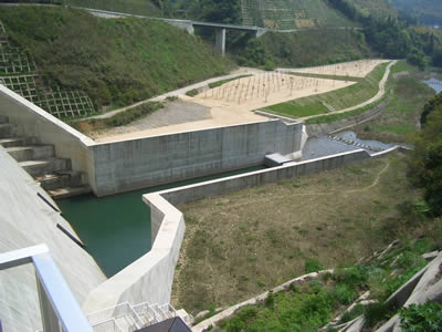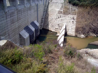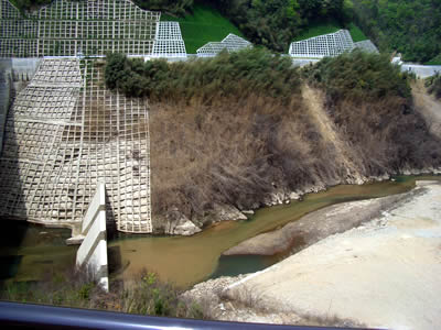 - (写真7)のように、ダム下流には放水による衝撃を抑えるために巨大なコンクリート排水路が設置されている。(武庫川ダムではこれが、高さ27メートル長さ100メートル以上になる)