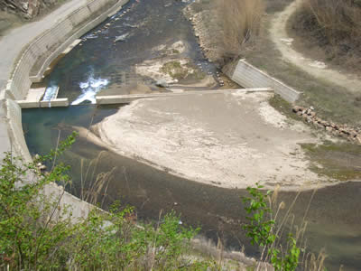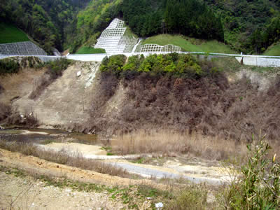 - (写真4)(写真5)は、土砂だめ。兵庫県の説明とは違い、土砂だめをやはり作っている。しかも、たった一度の湛水試験で、土砂だめの堰堤の上部にまで土砂が溜まり始めている。