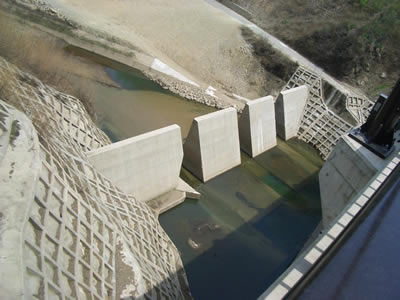(1)穴あきダムの実例の益田川ダム(島根県益田市)調査結果 湛水試験が終わった後の4月末に現地調査。 - (写真2)のように、ダム底部に2箇所穴が開いている穴あきダム。