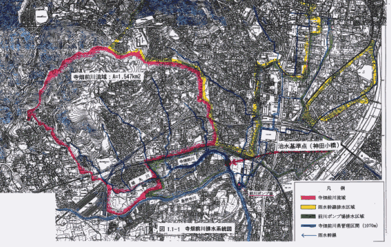 寺畑前川流域はほぼJR宝塚線(福知山線)に沿う山麓線を境に上流域と下流域に分けられる。上流域はほぼ宝塚市の雲雀が丘地域(一部花屋敷地域)と一致し、住宅開発が進んでいる山地斜面である。川西市に属する下流域は、上流域から流れ込む1号幹線〜3号幹線と呼ばれる支流を集め、最明寺川に合流するものである。寺畑前川の地形図を図−1に示す。