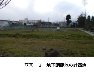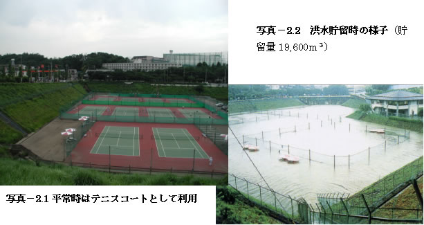 平面的で多目的な調節池として、普段はテニスコートとして利用されている横浜市の洪水調節池の例を写真−2.1及び写真−2.2に示す。また、兵庫県によって計画されている地下調節池計画地の現況を写真−3に示す。