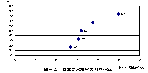 ここで5個の基本高水流量の計算値をグラフ上にプロットし、それぞれのカバー率を計算した結果のグラフを図−4に示す。