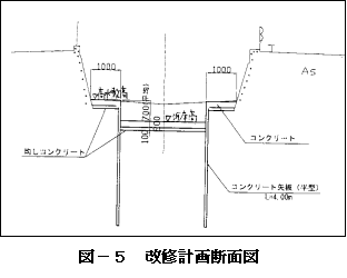 河床を70cm切り下げする工事(図−5)はほぼ完成しており、これにより河床の切り下げ前の疎通能力6.7立方メートル/sは15立方メートル/sとなるよう大きく改善されている(県の報告書V−38頁)。しかも護岸天端の余裕高さ30pも確保されている。上記のグラフによればカバー率50%となる流量は16立方メートル/sであり、これを基本高水流量とすると、河床切り下げ後の疎通能力15立方メートル/sは所定の余裕高さも見込んだ数値であることから、現状の河道においても相当の安全性が確保されていると考えられる。これらの改修工事の完了した河道の現況を写真−1に示す。