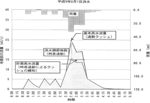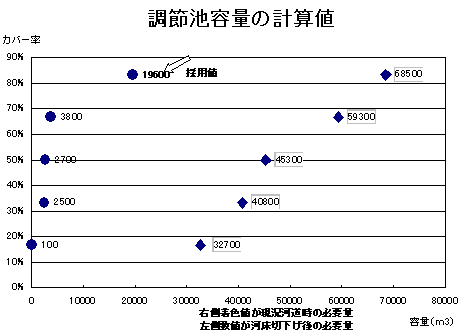 このグラフにおいて、左側の5個の●印の数値が河床切り下げ後の疎通能力に対応する必要な調節池容量を示しており、河床切り下げ前の必要な調節池容量(右側◆印で示した網かけの数値)に比べて改善効果の大きいことが分かる。つまり河道の疎通能力をもう少しでも改善できれば、もっと小さな容量で済むことができることが伺われる。